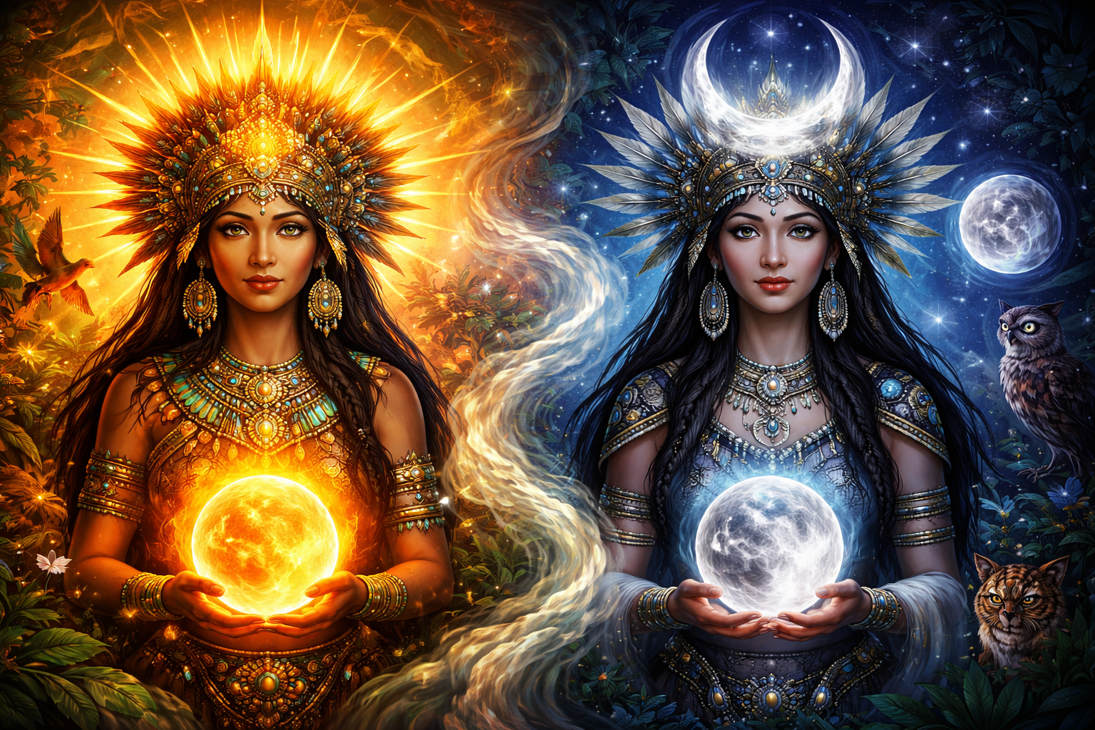 Her transformation into an owl or the moon reflects the dual nature of light and darkness, wisdom and mystery.